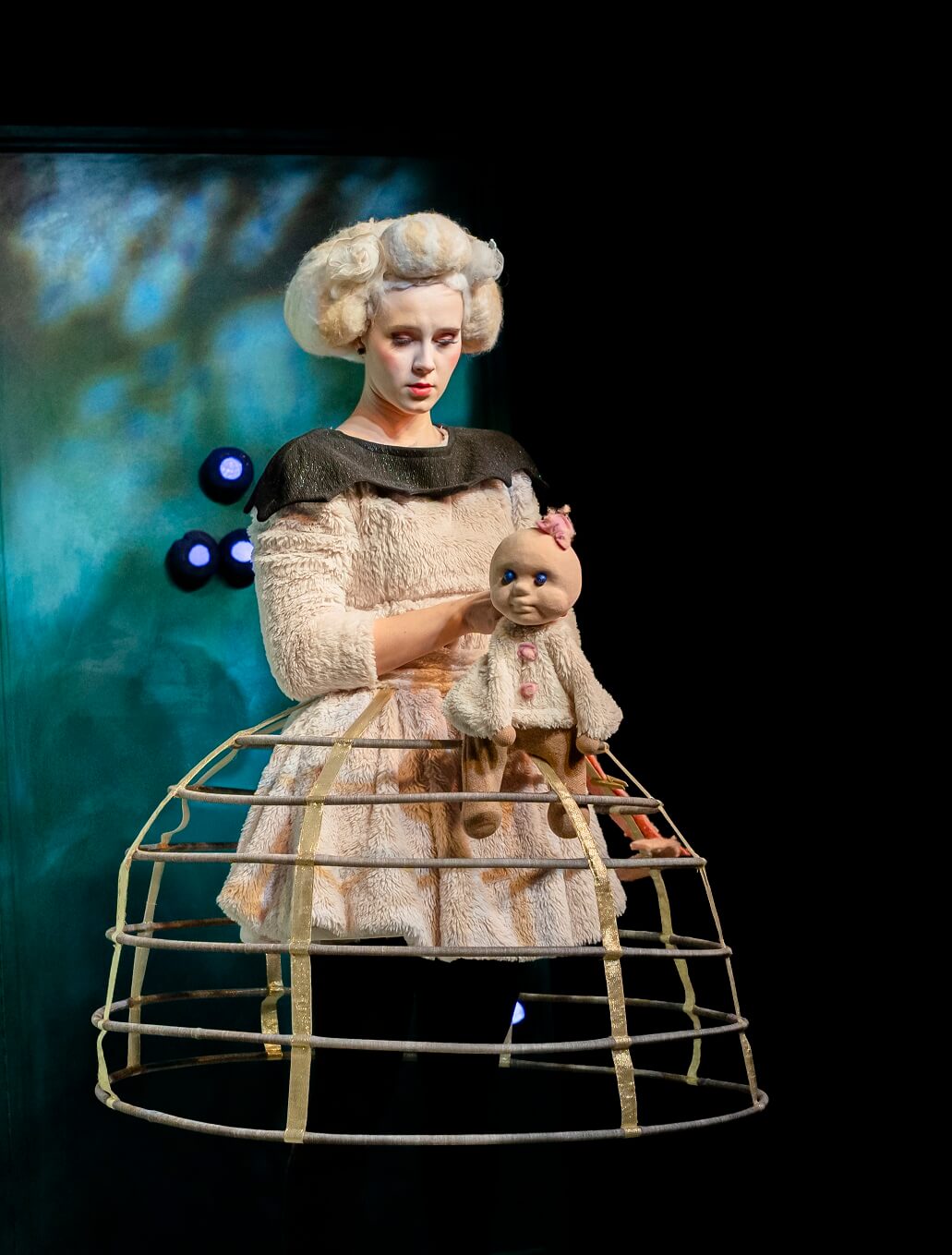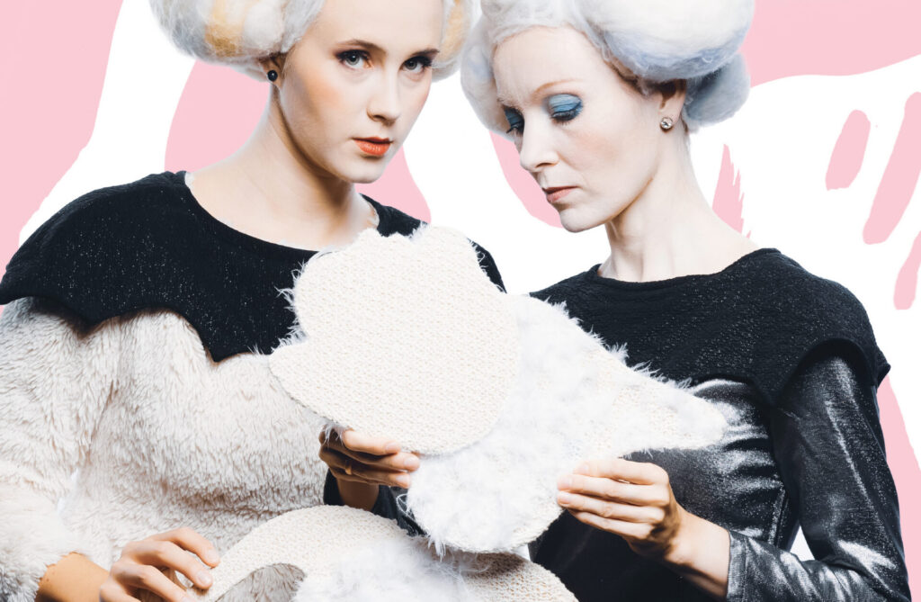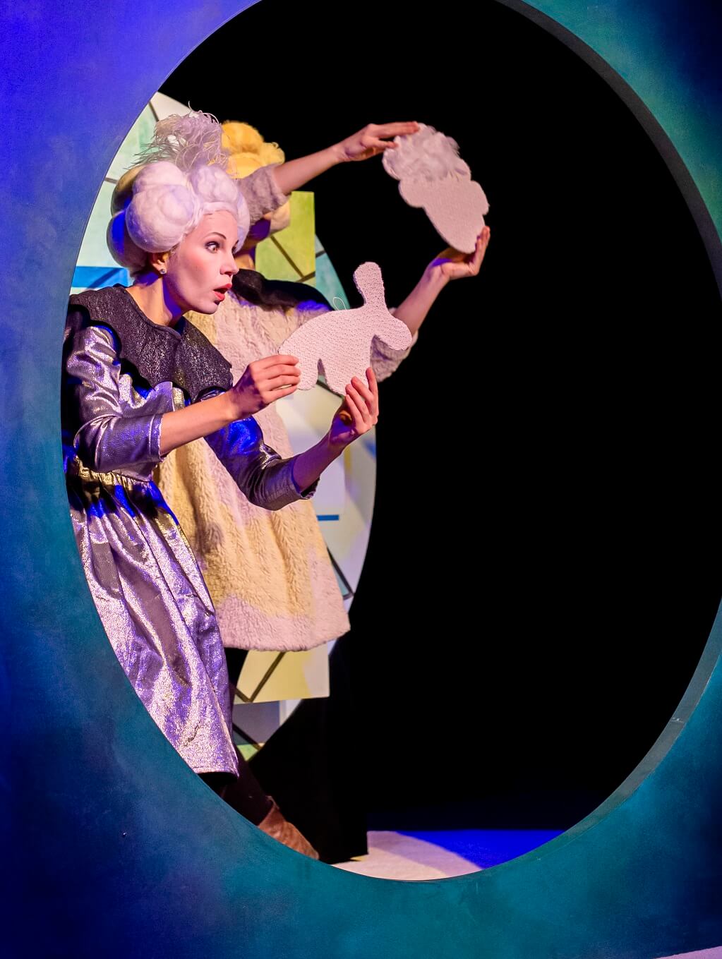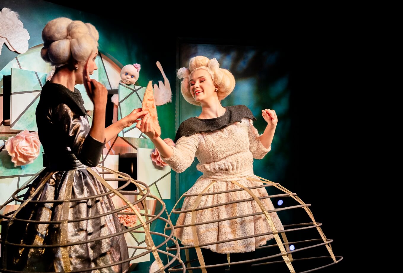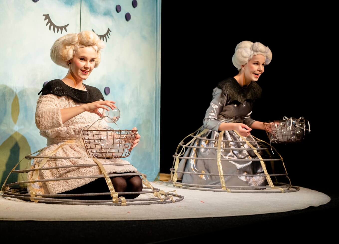 Kaks naisnäitlejat suurte valgete parukatega, hoidmas käes pehmet valget nukku