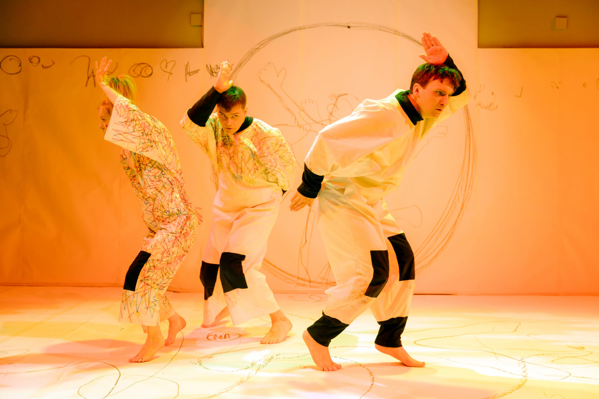3 näitlejat joonistavad kriitidega paberile.